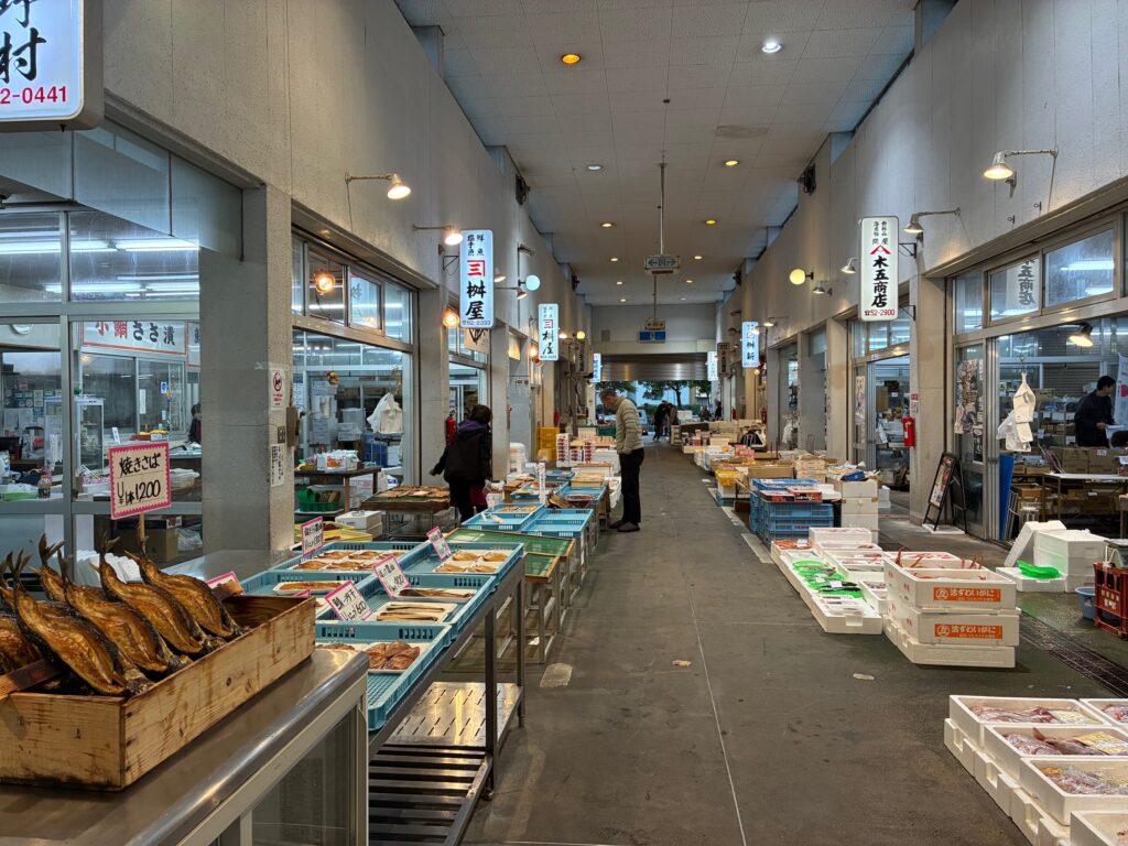 今日は雪の降る寒い朝でした。連日盛況の魚市場もまだ人影はまばら。新鮮な若狭の魚、干物、醤油干しもたくさん並んでいます。焼き干物:希登のお魚、干物も若狭小浜にて生産されています。